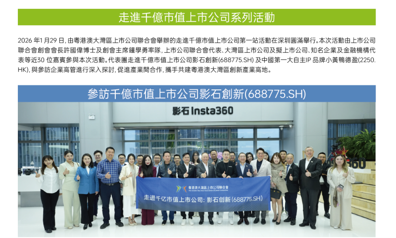 2026年1月29 日,由粵港澳大灣區上市公司聯合會舉辦的走進千億市值上市公司第一站活動在深圳圓滿舉行。 本次活動由上市公司聯合會創會會長許國偉博士及創會主席鍾學勇率隊, 上市公司聯合會代表、大灣區上市公司及擬上市公司、知名企業及金融機構代表等近30 位嘉賓參與本次活動,代表團走進千億市值上市公司影石創新(688775.SH)及中國第一大自主IP品牌小黃鴨德盈(2250HK),與參訪企業高管進行深入探討, 促進產業間合作,攜手共建粵港澳大灣區創新產業高地。