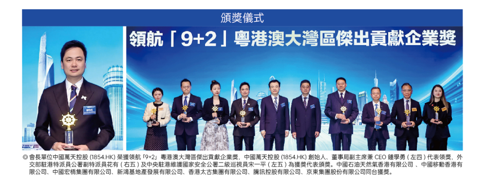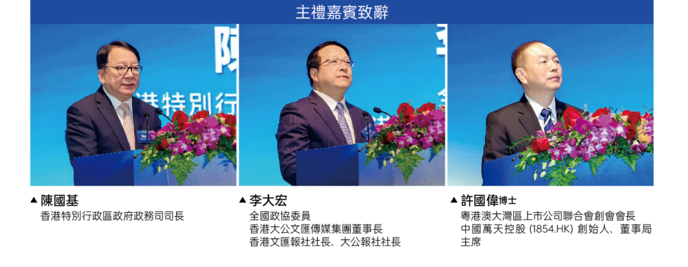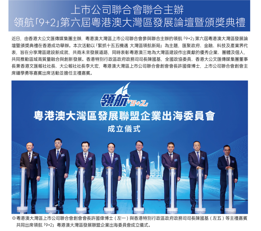 近日,由香港大公文匯傳媒集團主辦,粤港澳大灣區上市公司聯合會參與聯合主辦的領航 [9+2第六屆粤港澳大灣區發展論壇暨頒獎典禮在香港成功舉辦。本次活動以「緊抓十五五機遇 大灣區領航新局」為主題,匯聚政府、金融、科技及產業界代表,旨在分享灣區建設新成就,共商未來發展道路,同時表彰粤港澳三地為大灣區建設作出貢獻的優秀企業、團體及個人,共同推動區域高質量融合與創新發展。香港特別行政區政府政務司司長陳國基,全國政協委員、香港大公文匯傳媒集團董事長兼香港文匯報社社長、大公報社社長李大宏,粤港澳大灣區上市公司聯合會創會會長許國偉博士,上市公司聯合會創會主席鍾學勇等嘉賓出席活動並擔任主禮嘉寞。