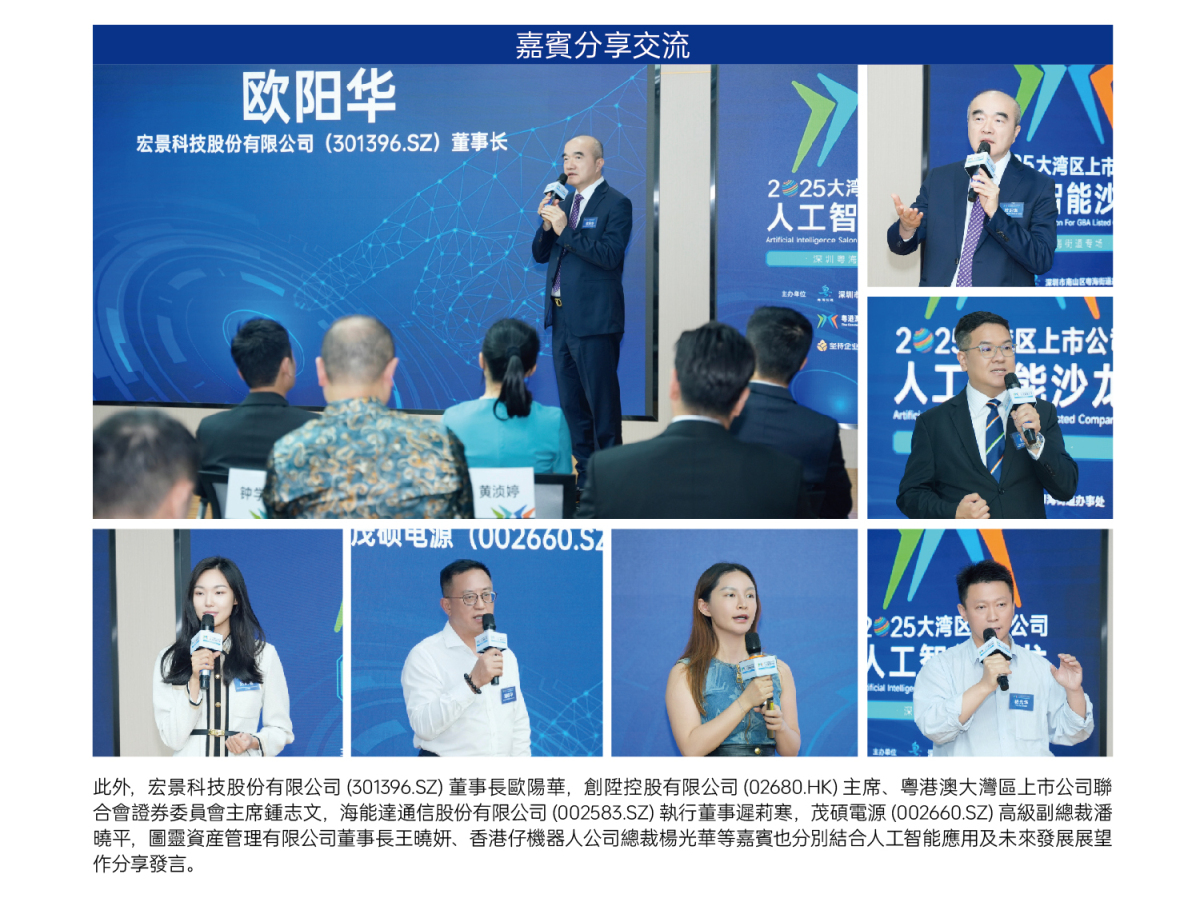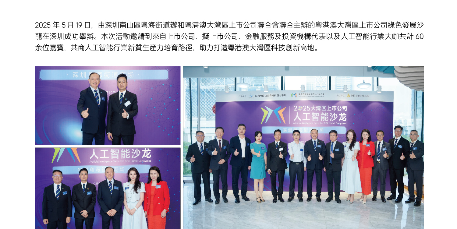 2025年5月19日,由深圳南山區粵海街道辦和粵港澳大灣區上市公司聯合會聯合主辦的粵港澳大灣區上市公司綠色發展沙龍在深圳成功舉辦。本次活動邀請到來自上市公司、擬上市公司、金融服務及投資機構代表以及人工智能行業大咖共計60余位嘉賓,共商人工智能行業新質生產力培育路徑,助力打造粵港澳大灣區科技創新高地。