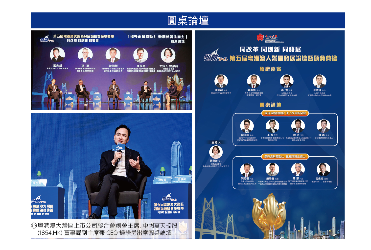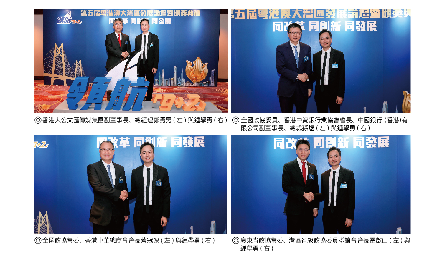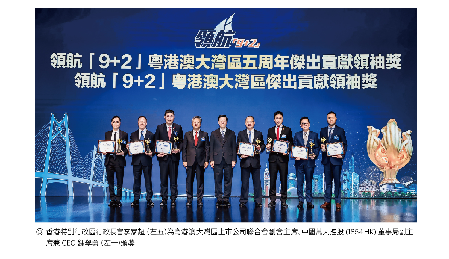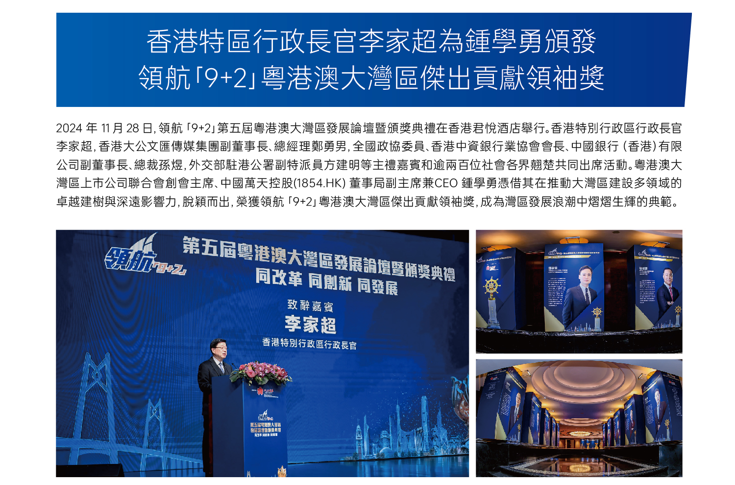 2024年11月28日,領航「9+2」第五屆粵港澳大灣區發展論壇暨頒獎典禮在香港君悅酒店舉行。香港特別行政區行政長官李家超,香港大公文匯傳媒集團副董事長、總經理鄭勇男,全國政協委員、香港中資銀行業協會會長、中國銀行(香港)有限公司副董事長、總裁孫煜,外交部駐港公署副特派員方建明等主禮嘉賓和逾兩百位社會各界翹楚共同出席活動。粵港澳大灣區上市公司聯合會創會主席、中國萬達控股(1854.HK)董事局副主席兼CEO 鍾學勇憑借其在推動大灣區建設多領域的卓越建樹與深遠影響力,脫穎而出,榮獲領航「9+2」粵港澳大灣區傑出貢獻領袖獎,成為灣區發展浪潮中熠熠生輝的典範。
