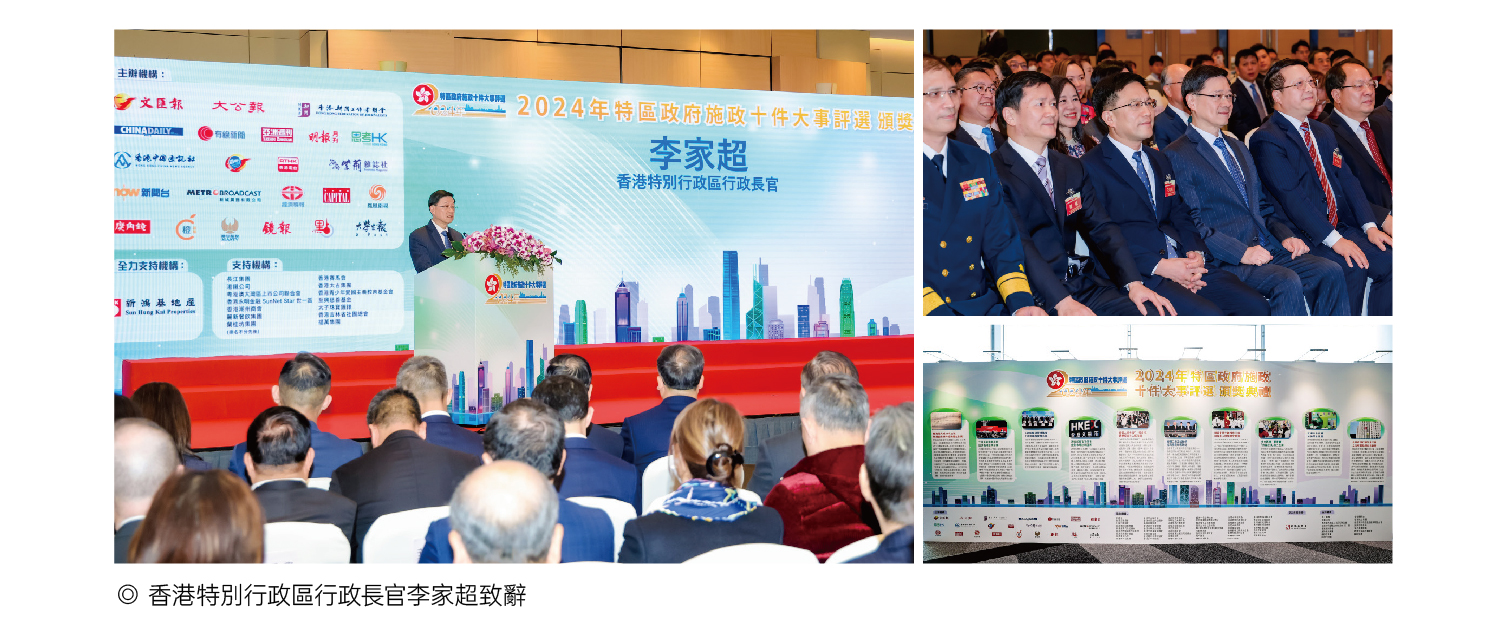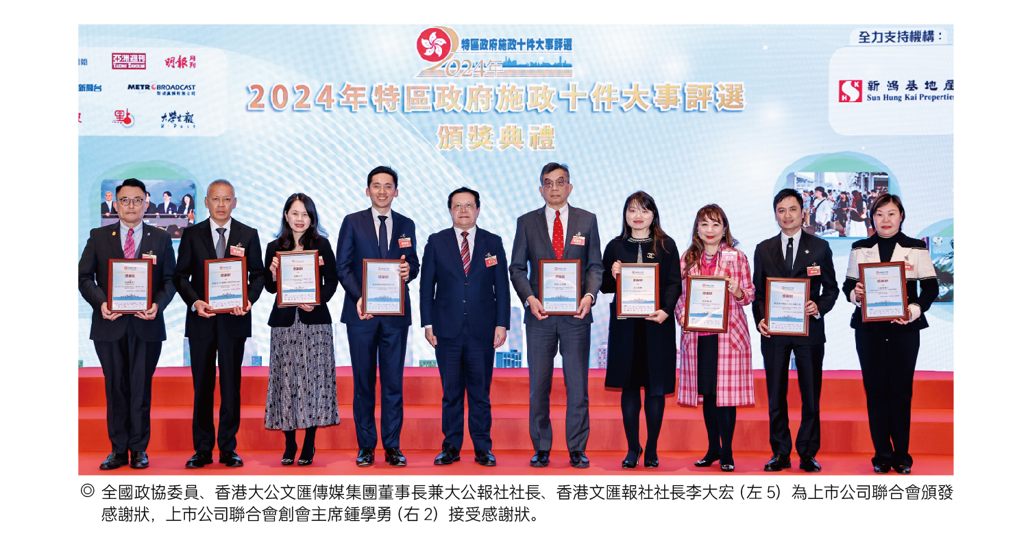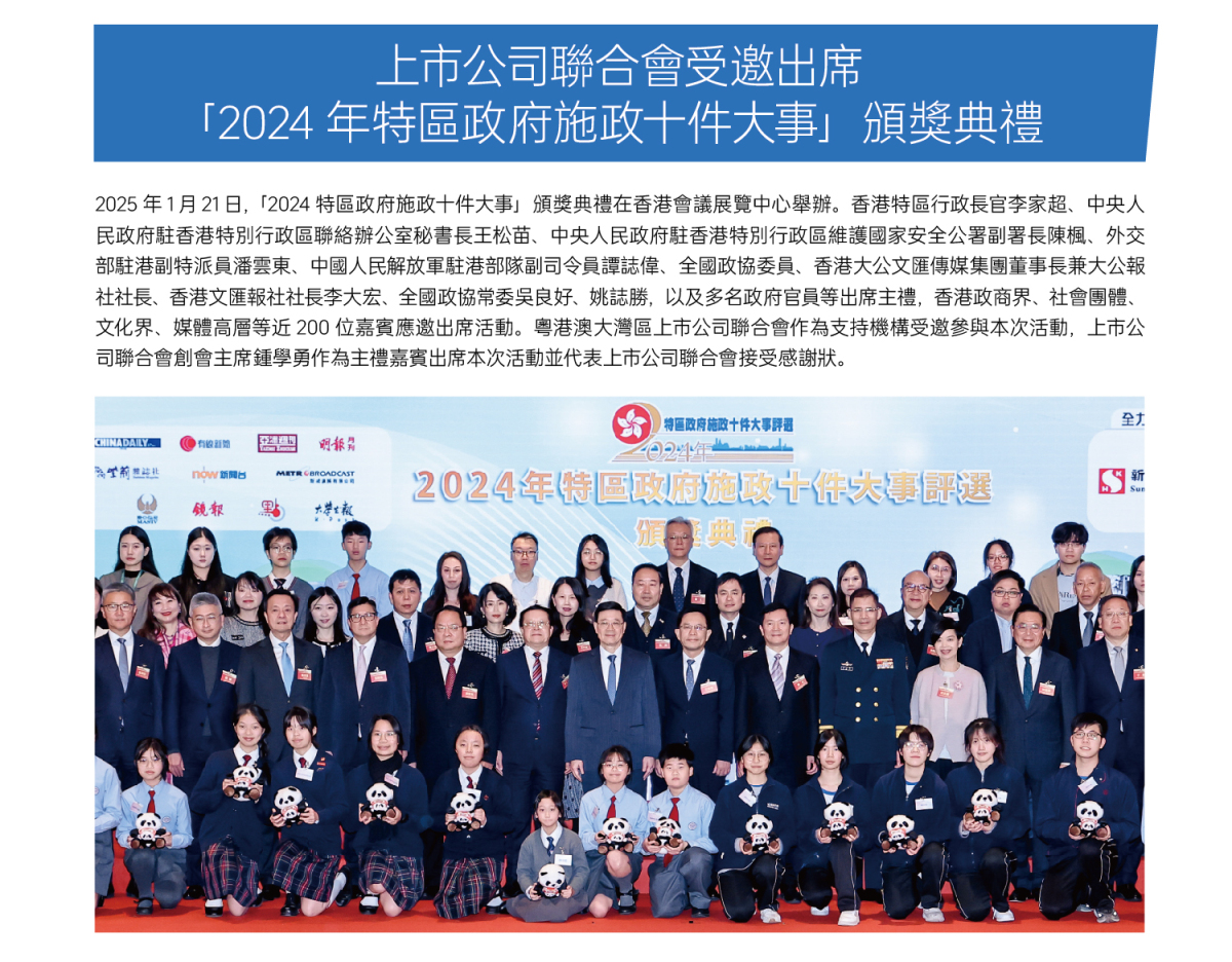 2025年1月21日,「2024特區政府施政十件大事」頒獎典禮在香港會議展覽中心舉辦。香港特區行政長官李家超、中央人民政府駐香港特別行政區聯絡辦公室秘書長王松苗、中央人民政府駐香港特別行政區維護國家安全公署副署長陳楓、外交部駐港副特派員潘雲東、中國人民解放軍駐港部隊副司令員譚志偉、全國政協委員、香港大公文匯傳媒集團董事長兼大公報社社長、香港文匯報社社長李大宏、全國政協常委吳良好、姚誌勝、以及多名政府官員等出席主禮,香港政商界、社會團體、文化界、媒體高層等近200位嘉賓應邀出席活動。粵港澳大灣區上市公司聯合會作為支持機構受邀參與本次活動。上市公司聯合會創會主席鍾學勇作為主禮嘉賓出席本次活動並代表上市公司聯合會接受感謝狀。