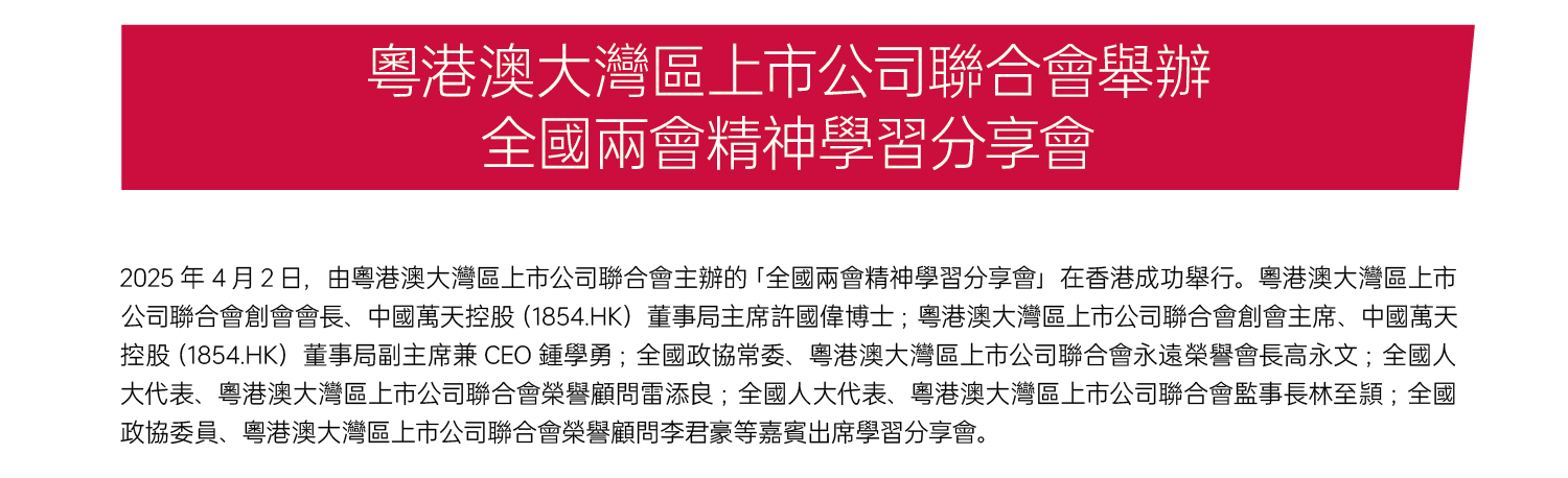 2025年4月2日,由粵港澳大灣區上市公司聯合會主辦的「全國兩會精神學習分享會」在香港成功舉行。粵港澳大灣區上市公司聯合會創會會長、中國萬天控股(1854.HK)董事局主席許國偉博士;粵港澳大灣區上市公司聯合會創會主席、中國萬天控股(1854.HK)董事局副主席兼 CEO 鍾學勇;全國政協常委、粵港澳大灣區上市公司聯合會永遠榮譽會長高永文;全國人大代表、粵港澳大灣區上市公司聯合會榮譽顧問雷添良;全國人大代表、粵港澳大灣區上市公司聯合會監事長林志穎;全國政協委員、粵港澳大灣區上市公司聯合會榮譽顧問李君豪等嘉賓出席學習分享會。