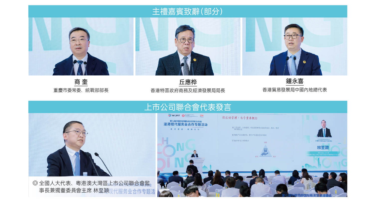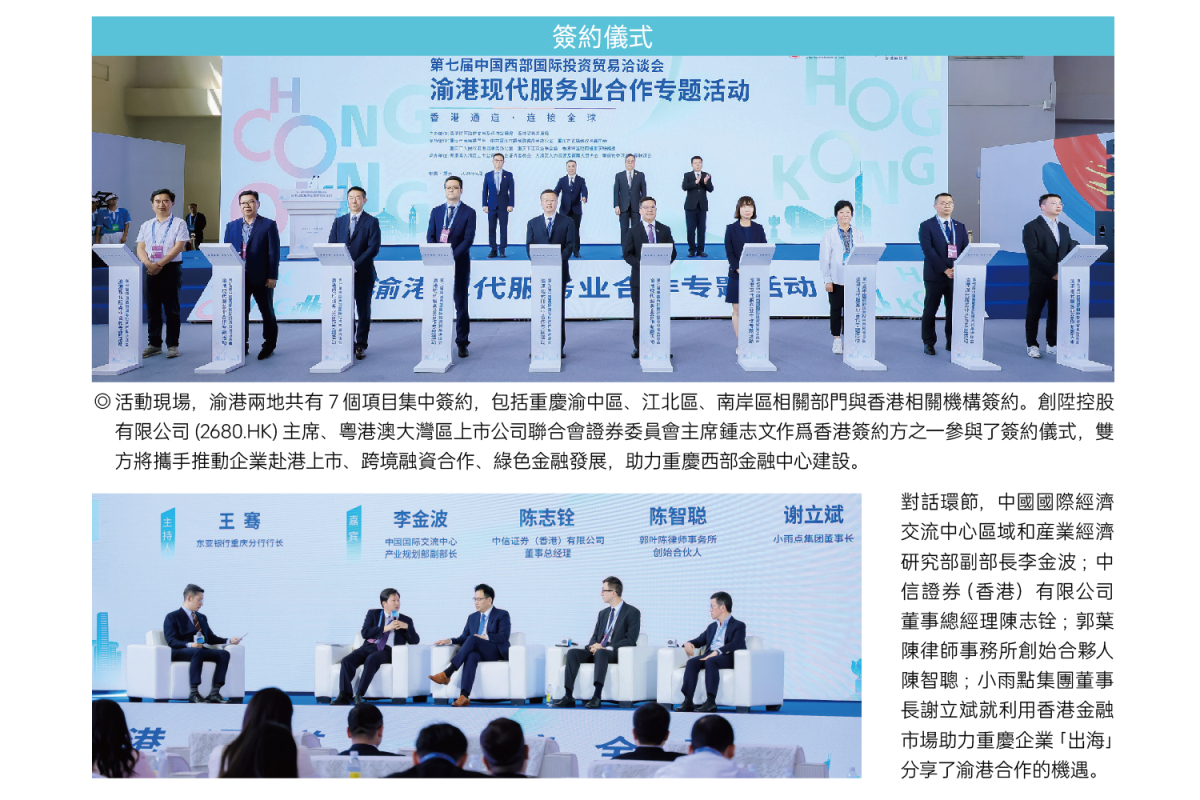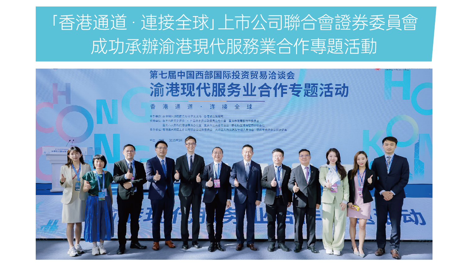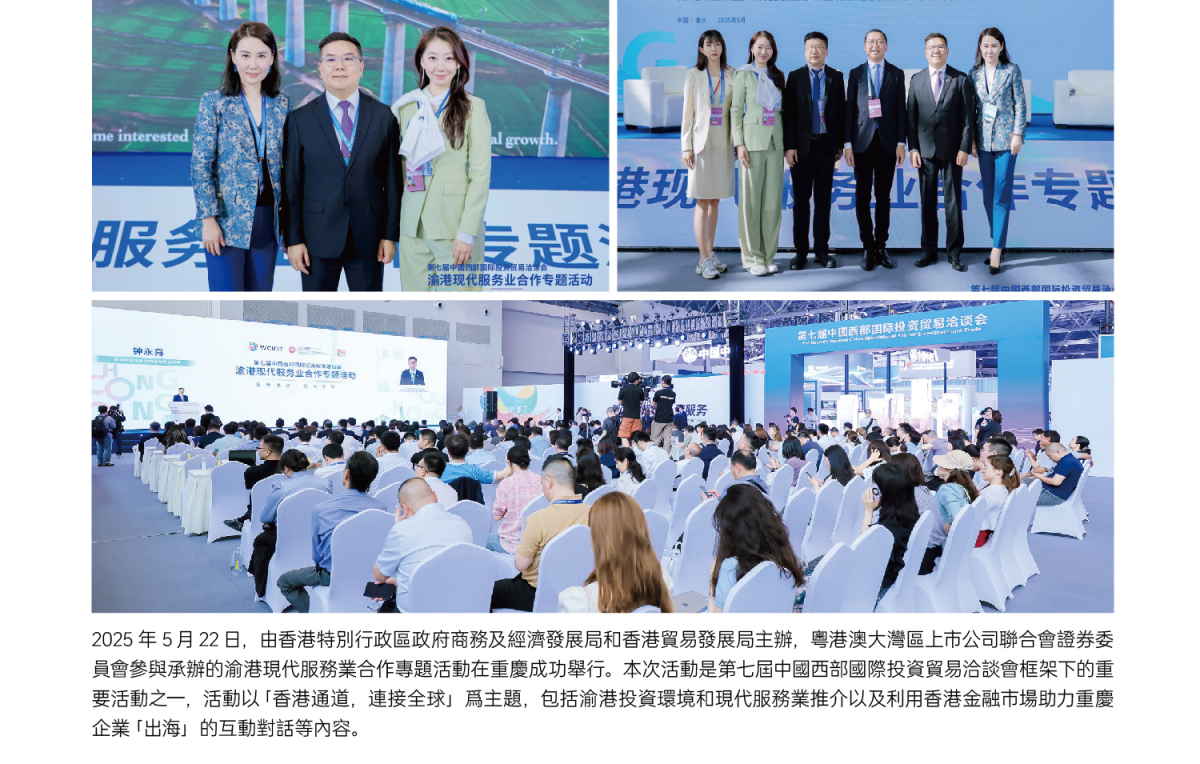 2025年5月22日,由香港特別行政區政府商務及經濟發展局和香港貿易發展局主辦,粵港澳大灣區上市公司聯合會證券委員會參與承辦的渝港現代服務業合作專題活動在重慶成功舉行。本次活動是第七屆中國西部國際投資貿易洽談會框架下的重要活動之一,活動以「香港通道,連接全球」為主題,包括渝港投資環境和現代服務業推介以及利用香港金融市場助力重慶企業「出海」的互動對話等內容。