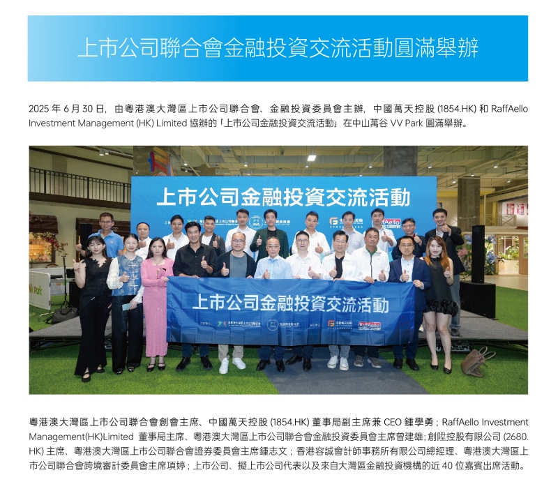2025年6月30日,由粤港澳大灣區上市公司聯合會、金融投資委員會主辦,中國萬天控股(1854.HK)和 RaffAelo Investment Management (HK)Limited 協辦的「上市公司金融投資交流活動」在中山萬谷 VV Park 圆滿舉辦。