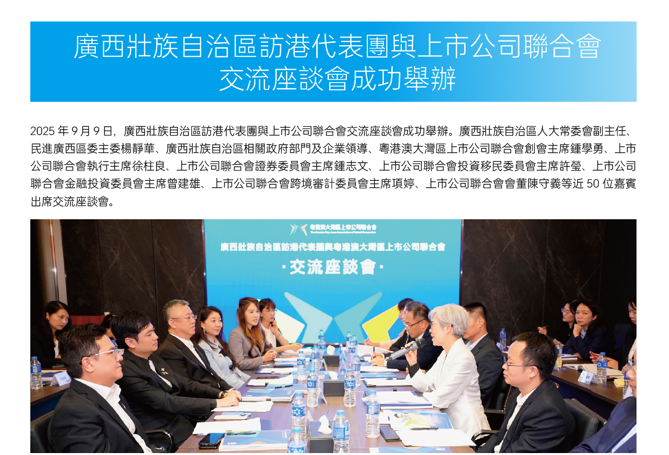 9月9日,廣西壯族自治區訪港代表團與上市公司聯合會交流座談會成功舉辦。廣西壯族自治區人大常委會副主任、民進廣西區委主委楊靜華、廣西壯族自治區相關政府部門及企業領導、粵港澳大灣區上市公司聯合會創會主席鍾學勇、上市公司聯合會執行主席徐柱良、上市公司聯合會證券委員會主席鍾志文、上市公司聯合會投資移民委員會主席許瑩、上市公司聯合會金融投資委員會主席曾建雄、上市公司聯合會跨境審計委員會主席項婷、上市公司聯合會會董陳守義等近50位嘉賓出席交流座談會。