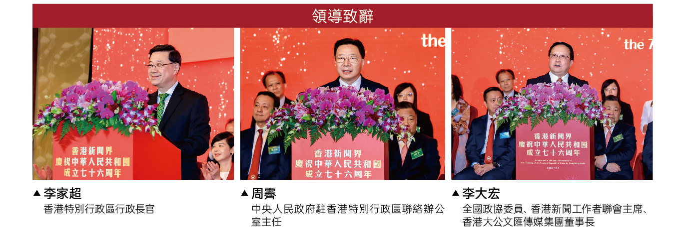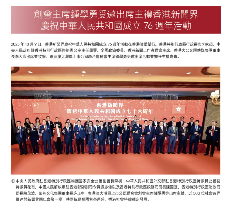 2025年10月9日,香港新聞界慶祝中華人民共和國成立76週年活動在香港隆重舉行。香港特別行政區行政長官李家超,中央人民政府駐香港特別行政區聯絡辦公室主任周霽,全國政協委員、香港新聞工作者聯會主席、香港大公文匯傳媒集團董事長李大宏出席並致辭。粵港澳大灣區上市公司聯合會創會主席鍾學勇受邀出席活動並擔任主禮嘉賓
