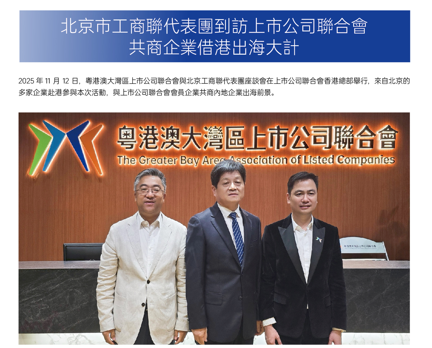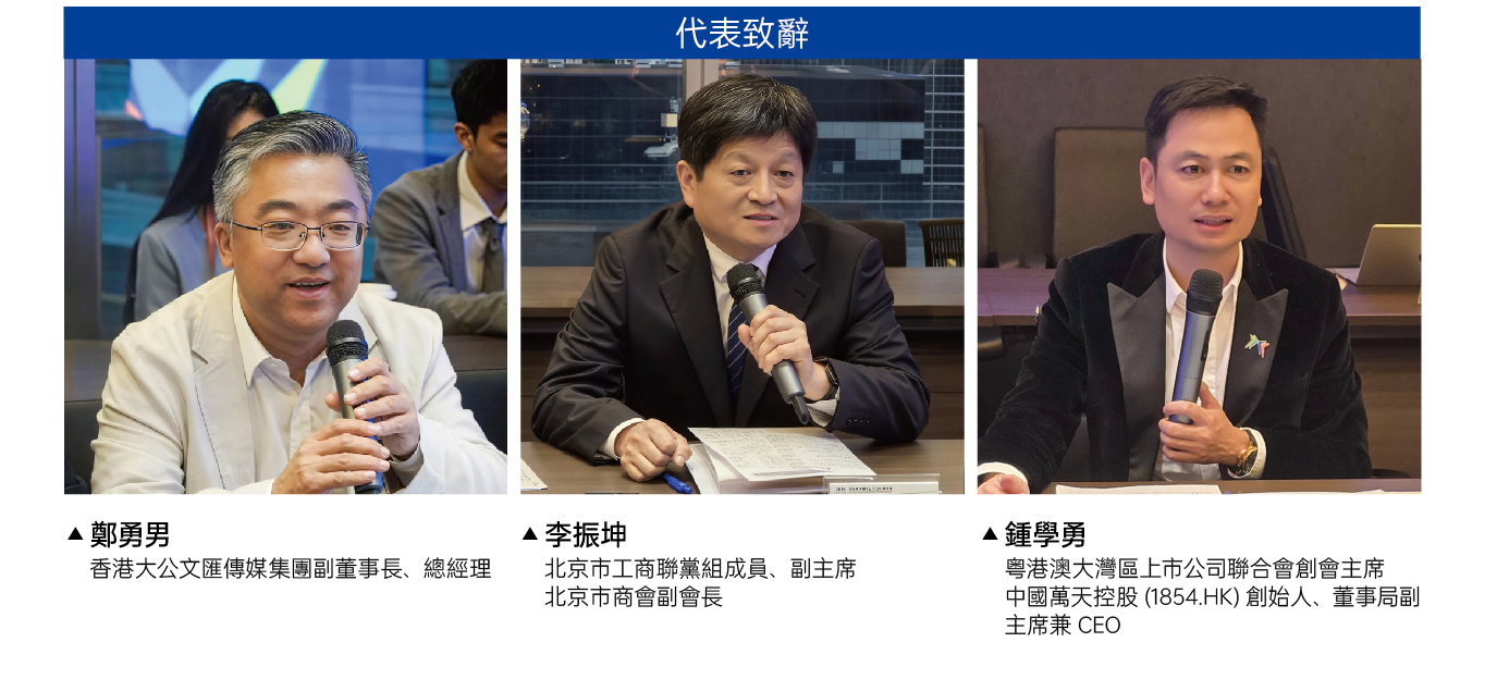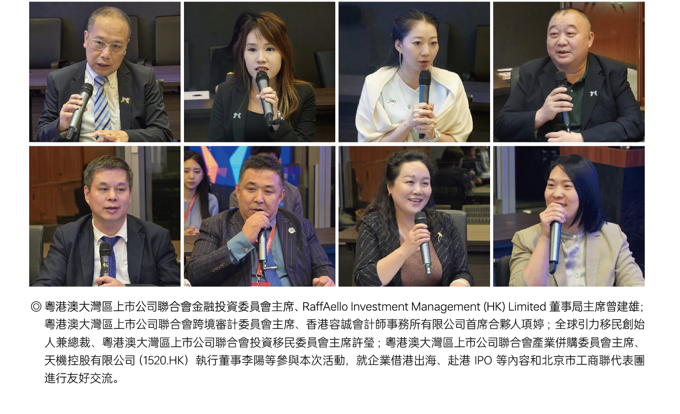 11月12日,粵港澳大灣區上市公司聯合會與北京工商聯代表團座談會在上市公司聯合會香港總部舉行,來自北京的多家企業赴港參與本次活動,與上市公司聯合會會員企業共商內地企業出海前景。