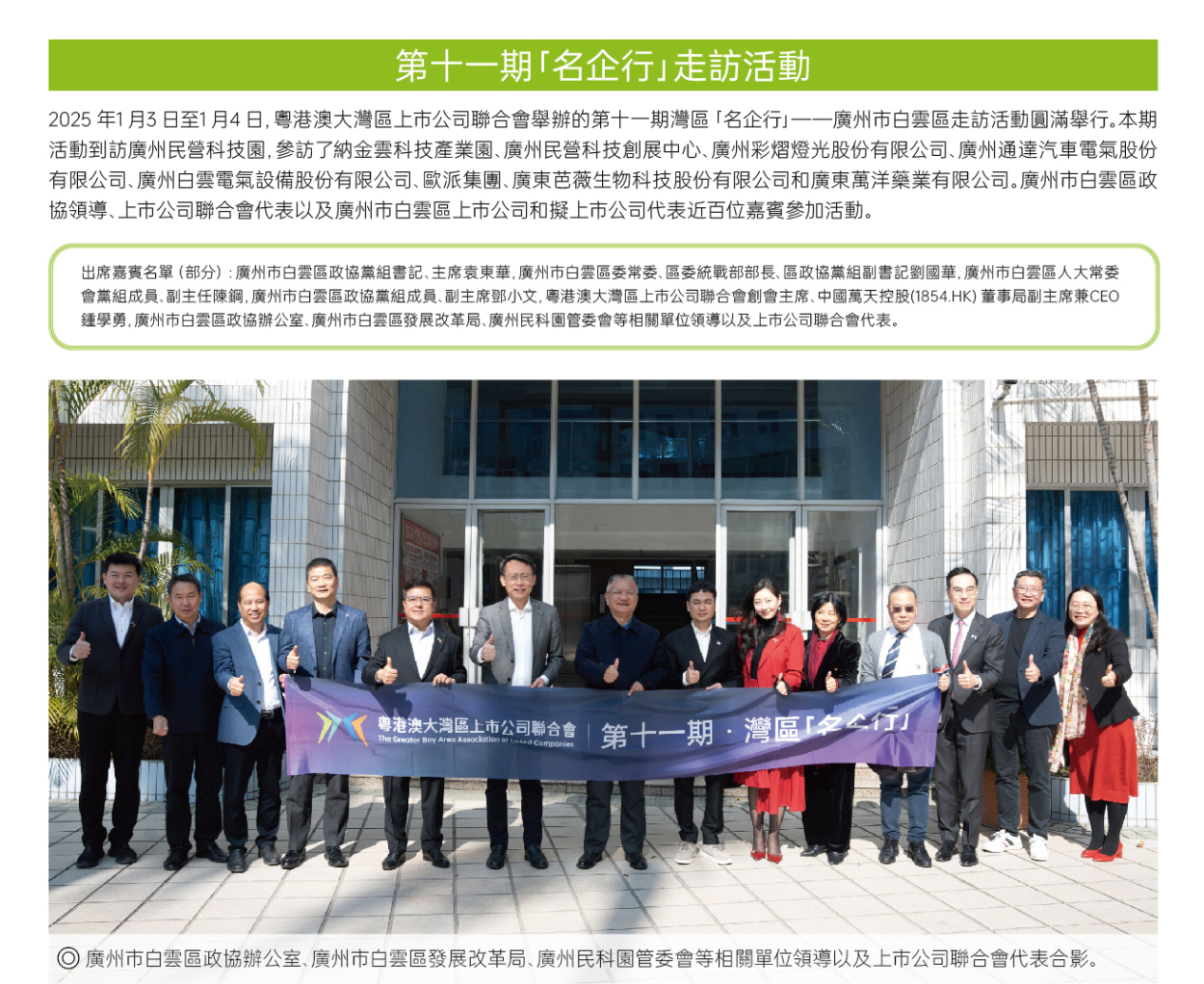 1月3日至1月4日,粵港澳大灣區上市公司聯合會舉辦的第十一期灣區“名企行”——廣州市白雲區走訪活動圓滿舉行。本期活動到訪廣州民營科技園,參訪了納金雲科技產業園、廣州民營科技創展中心、廣州彩熠燈光股份有限公司、廣州通達汽車電氣股份有限公司、廣州白雲電氣設備股份有限公司、歐派集團、廣東芭薇生物科技股份有限公司和廣東萬洋藥業有限公司。廣州市白雲區政協領導、上市公司聯合會代表以及廣州市白雲區上市公司和擬上市公司代表近百位嘉賓參加活動。