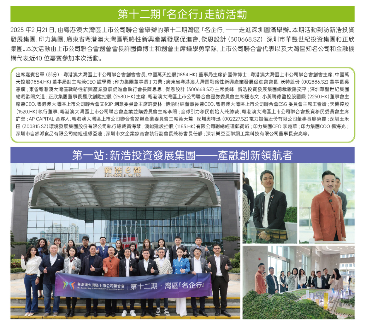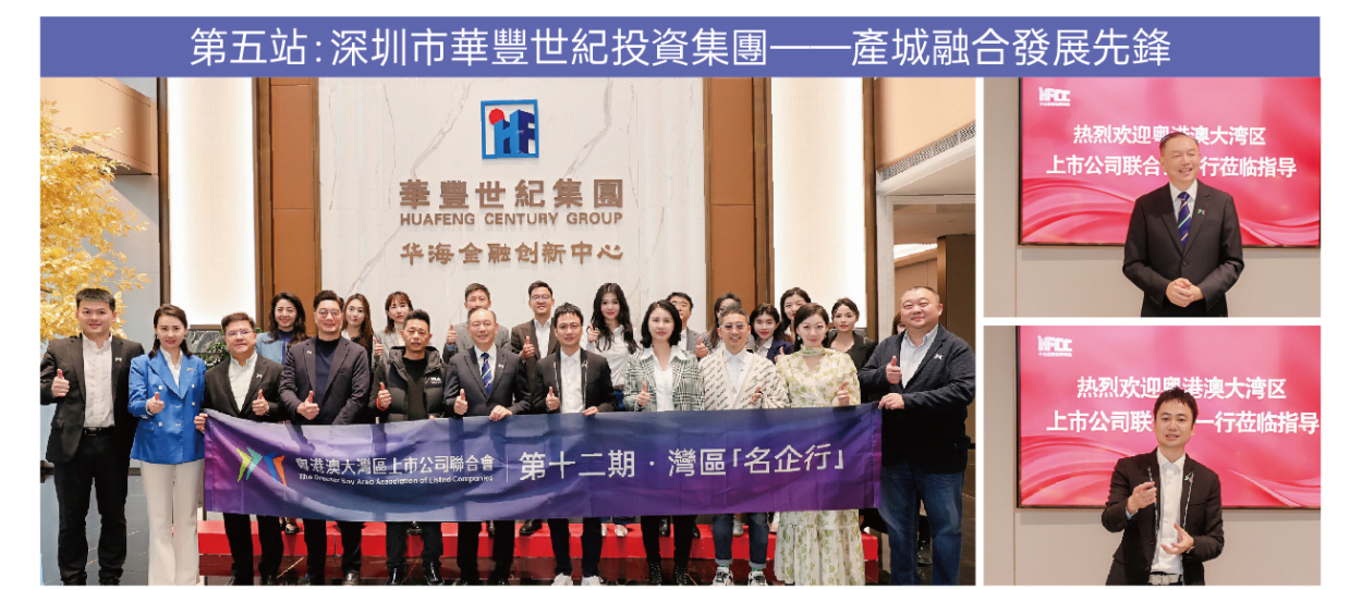 2025年2月21日,由粤港澳大灣區上市公司聯合會舉辦的第十二期灣區「名企行」--走進深圳圆滿舉辦。本期活動到訪新浩投資發展集團、印力集團、廣東省粤港澳大灣區戰略性新興產業發展促進會、傑恩設計(300668.Z)、深圳市華豐世紀投資集團和正欣集團。本次活動由上市公司聯合會創會會長許國偉博土和創會主席鍾學勇率隊,上市公司聯合會代表以及大灣區知名公司和金融機構代表近40 位嘉賓参加本次活動。