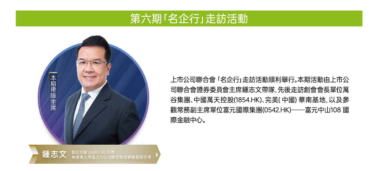 11月8日,上市公司聯合會“名企行”走訪活動順利舉行。本期活動由上市公司聯合會證券委員會主席鐘志文帶隊,先後走訪創會會長單位萬谷集團、中國萬天控股(1854.HK)、完美(中國)華南基地,以及參觀常務副主席單位富元國際集團(0542.HK)——富元中山108國際金融中心。上市公司聯合會主席團、上市公司主席、金融機構及投資銀行代表等30多位嘉賓出席走訪活動。