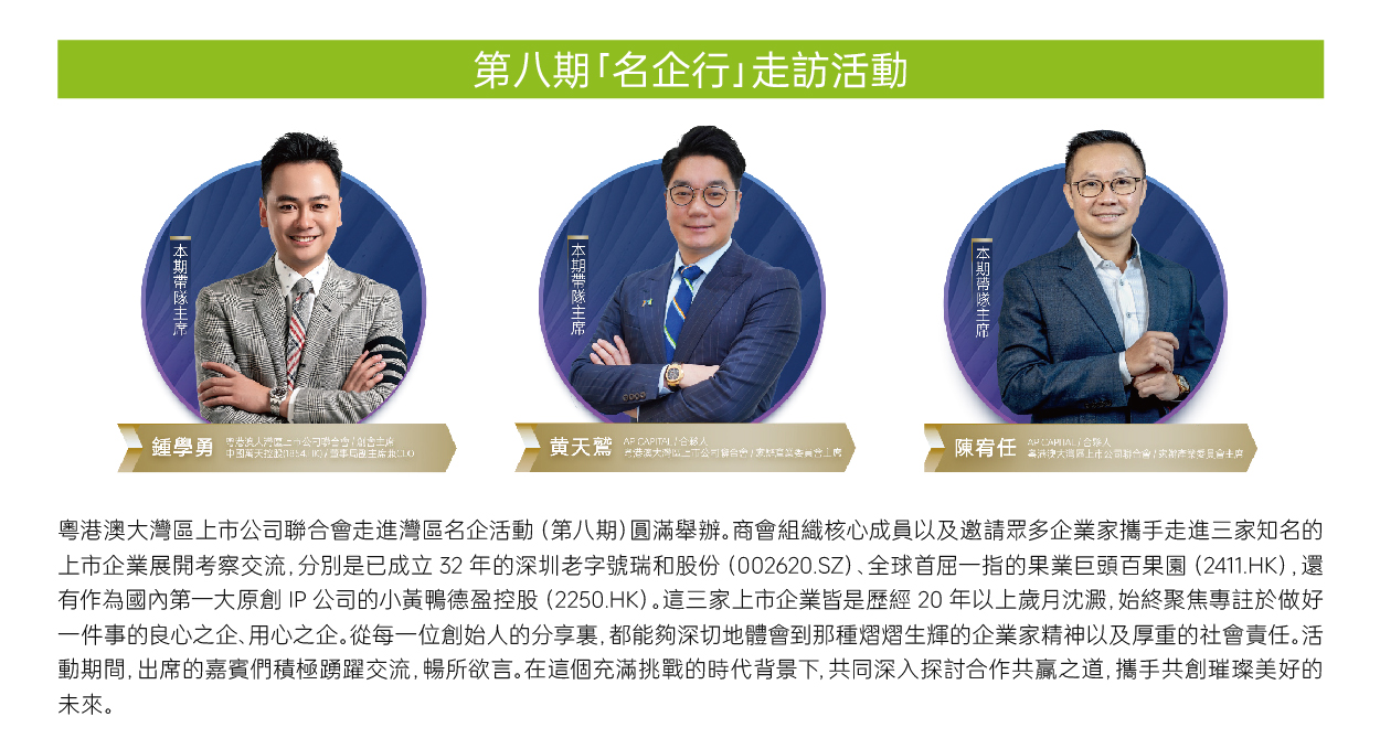 粤港澳大灣區上市公司聯合會走進灣區名企活動(第八期)圓滿舉辦。商會組織核心成員以及邀請眾多企業家攜手走進三家知名的上市企業展開考察交流,分别是已成立 32年的深圳老字號瑞和股份(002620.SZ)、全球首屈一指的果業巨頭百果園 (2411.HK),還有作為國內第一大原創IP 公司的小黃鴨德盈控股(2250.HK)。這三家上市企業皆是歷經 20 年以上歲月沈澱,始終聚焦專註於做好一件事的良心之企、用心之企。從每一位創始人的分享裏,都能夠深切地體會到那種熠熠生輝的企業家精神以及厚重的社會责任。活動期間,出席的嘉賓們積極踴躍交流,所欲言,在這個充滿挑戰的時代背景下,共同深入探討合作共贏之道,攜手共創璀璨美好的未來。