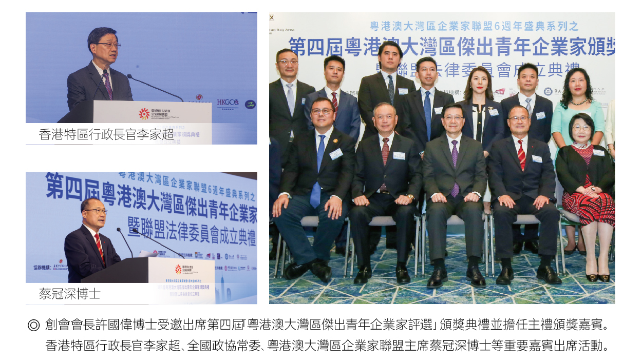 創會會長許國偉博士受邀出席第四屆粤港澳大灣區傑出青年企業家評選」頒獎典禮並擔任主禮頒獎嘉賓,香港特區行政長官李家超、全國政協常委、粤港澳大灣區企業家聯盟主席蔡冠深博士等重要嘉賓出席活動。