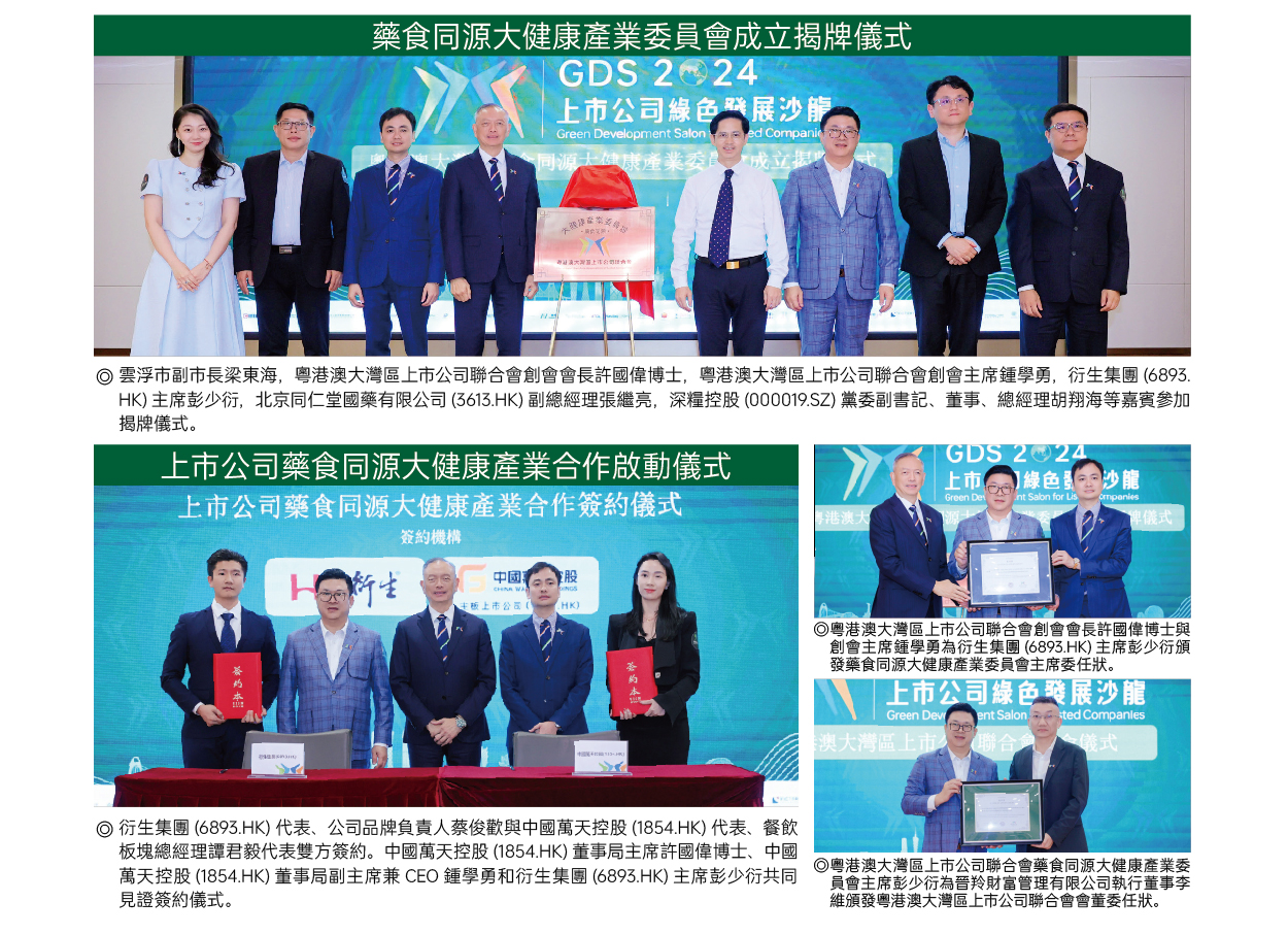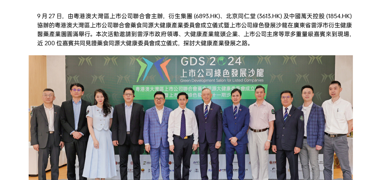 9月27日,由粵港澳大灣區上市公司聯合會主辦,衍生集團(6893.港元),北京同仁堂(3613. . hk)及中國萬天控股(1854. . hk)協辦的粵港澳大灣區上市公司聯合會藥食同源大健康委員會成立儀式暨上市公司綠色發展第十一期沙龍在廣東省雲浮市衍生健康醫藥產業園圓滿舉行。